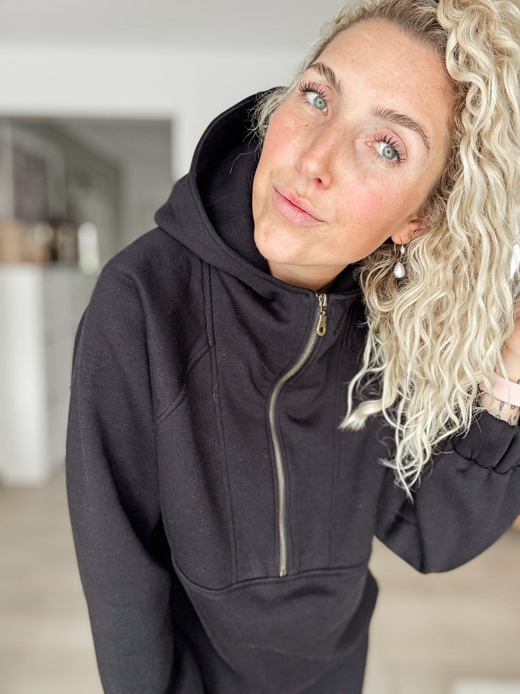 - Details: Halbzipper in Gold, elastische Ärmelbündchen, Oversize-Passform, seitliche Taschen