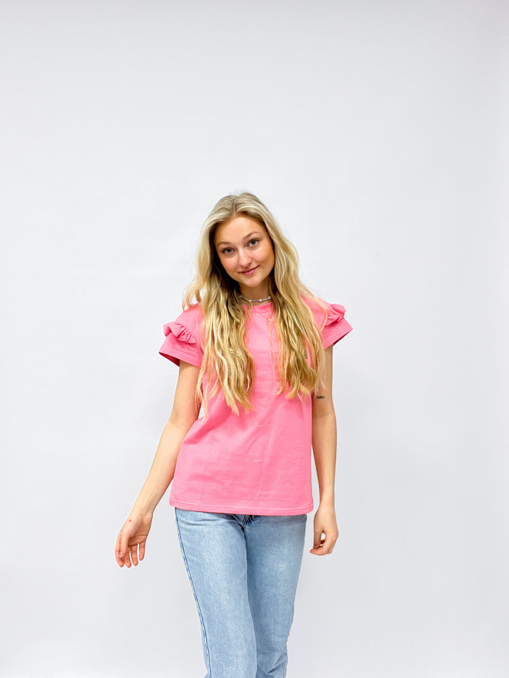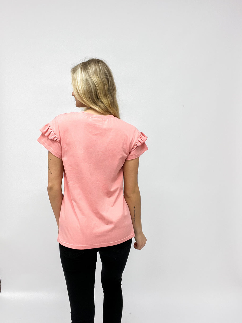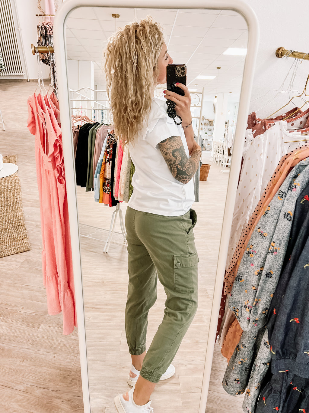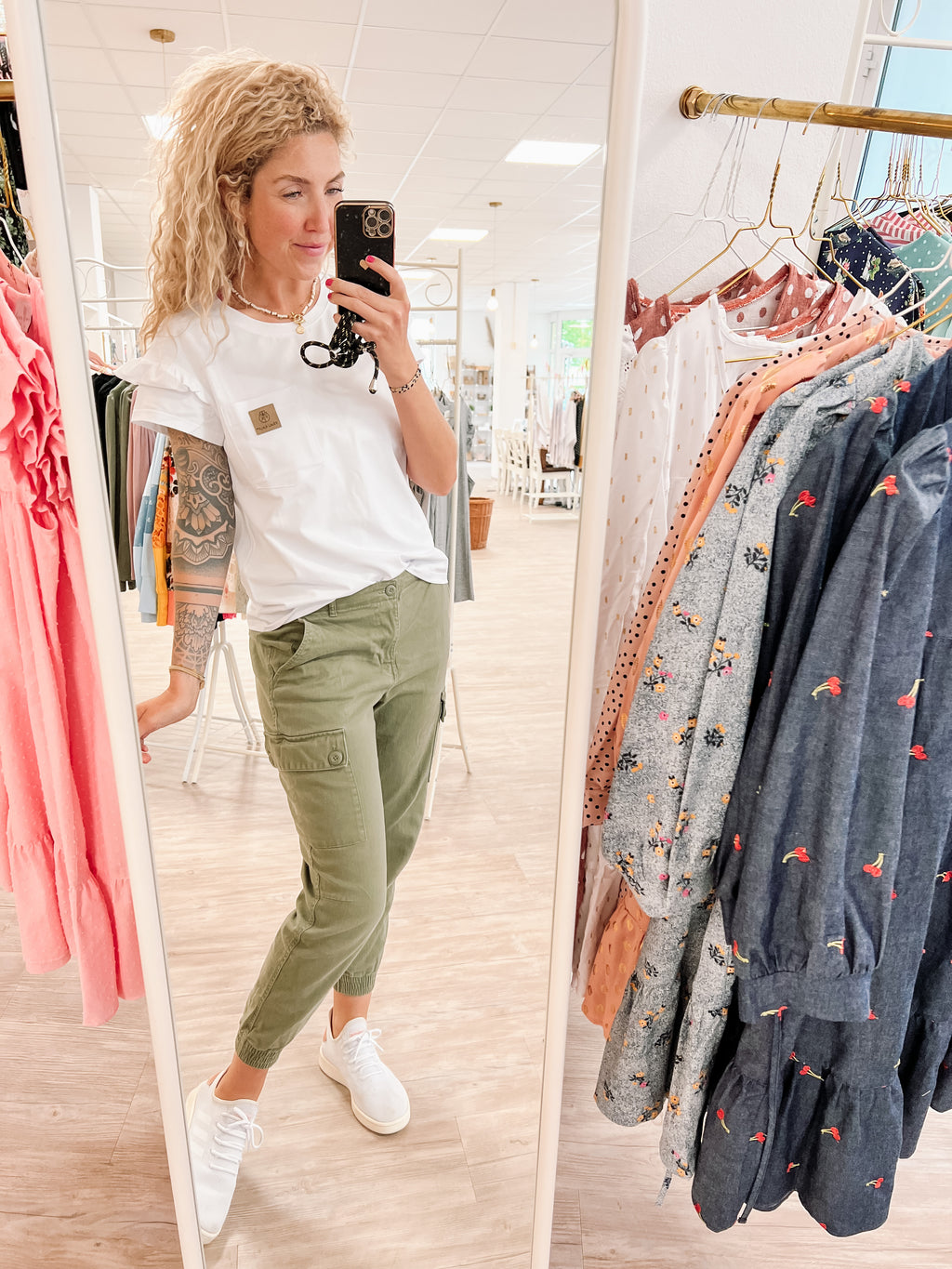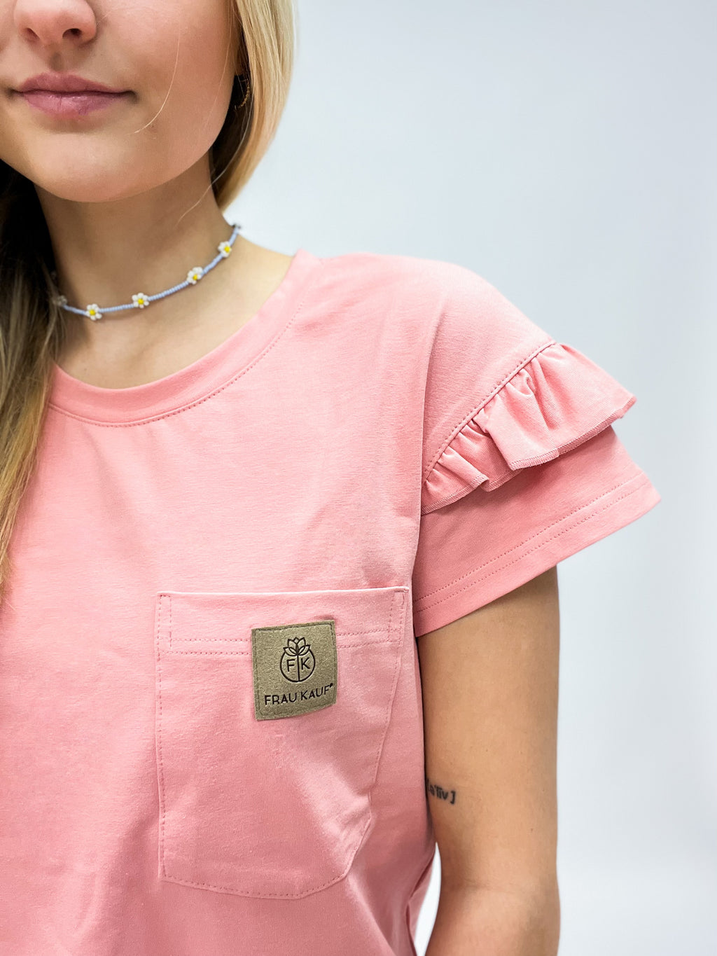 HAZEL- ein stylisches, leger geschnittenes Shirt, welches durch die Rüschen am Arm einen echter Hingucker unter den T-Shirts wird. Es ist sowohl im Alltag aber auch zu besonderen Anlässen einsetzbar.