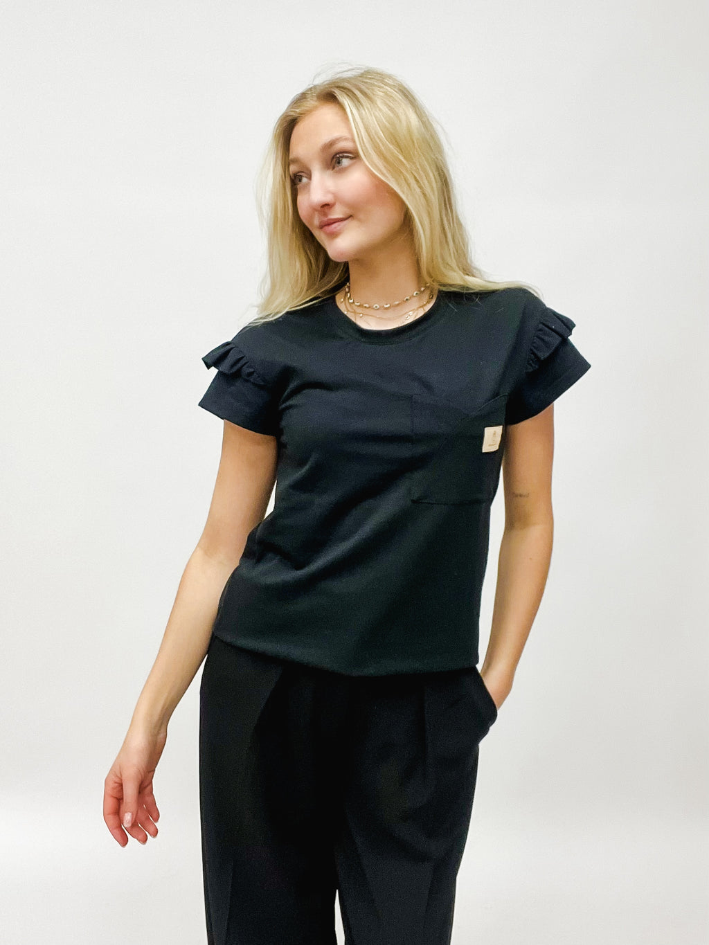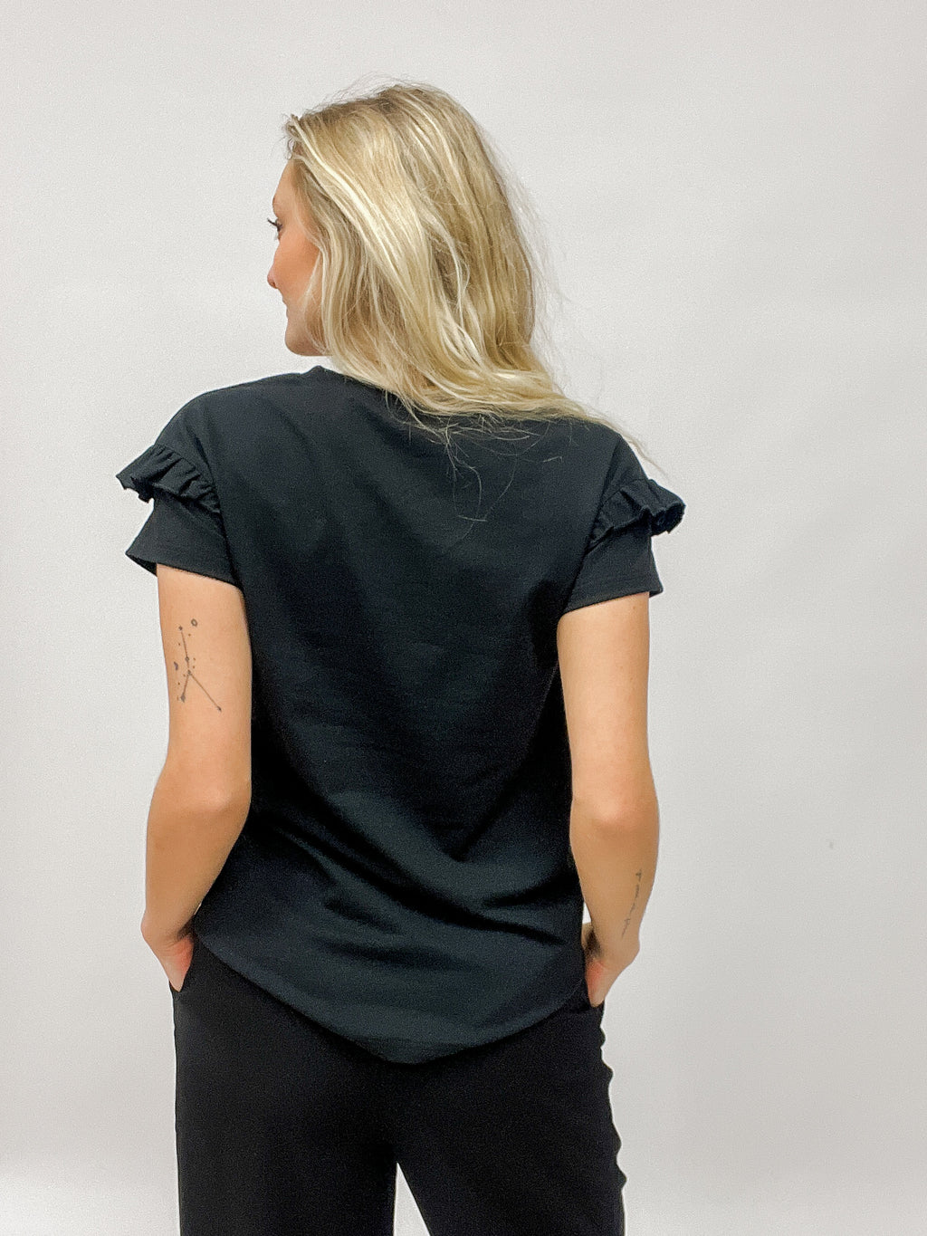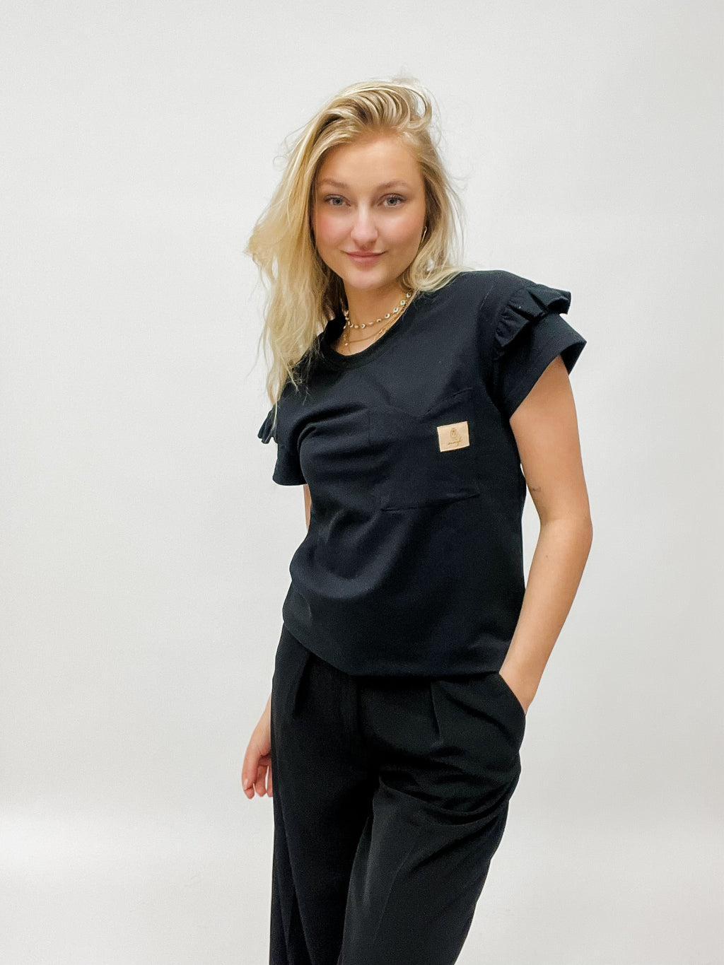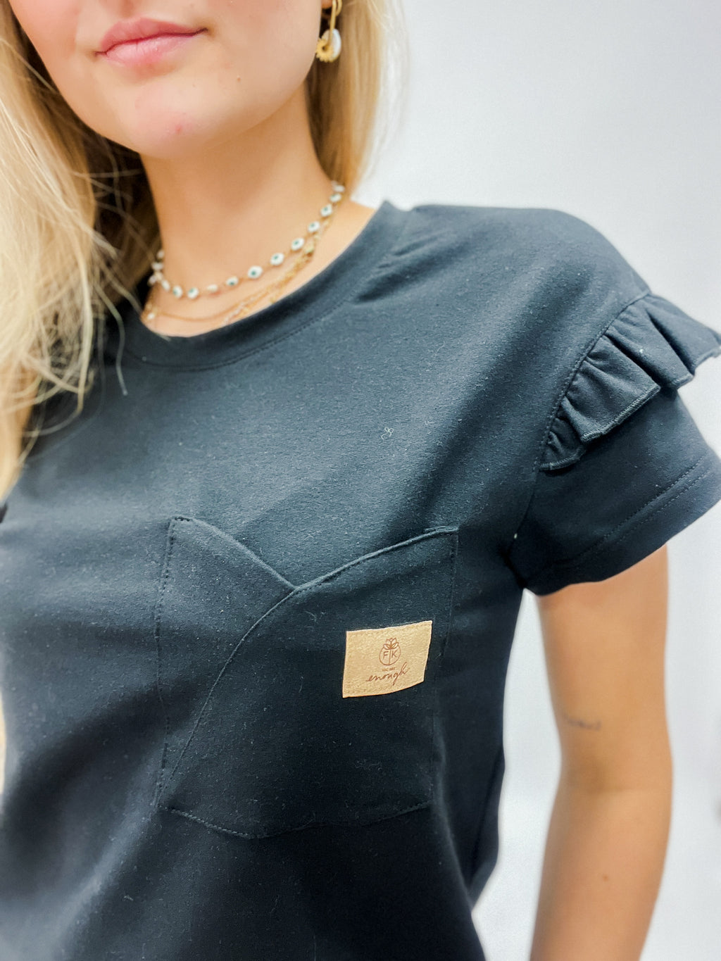 HAZEL- ein stylisches, leger geschnittenes Shirt, welches durch die Rüschen am Arm einen echter Hingucker unter den T-Shirts wird. Es ist sowohl im Alltag aber auch zu besonderen Anlässen einsetzbar.