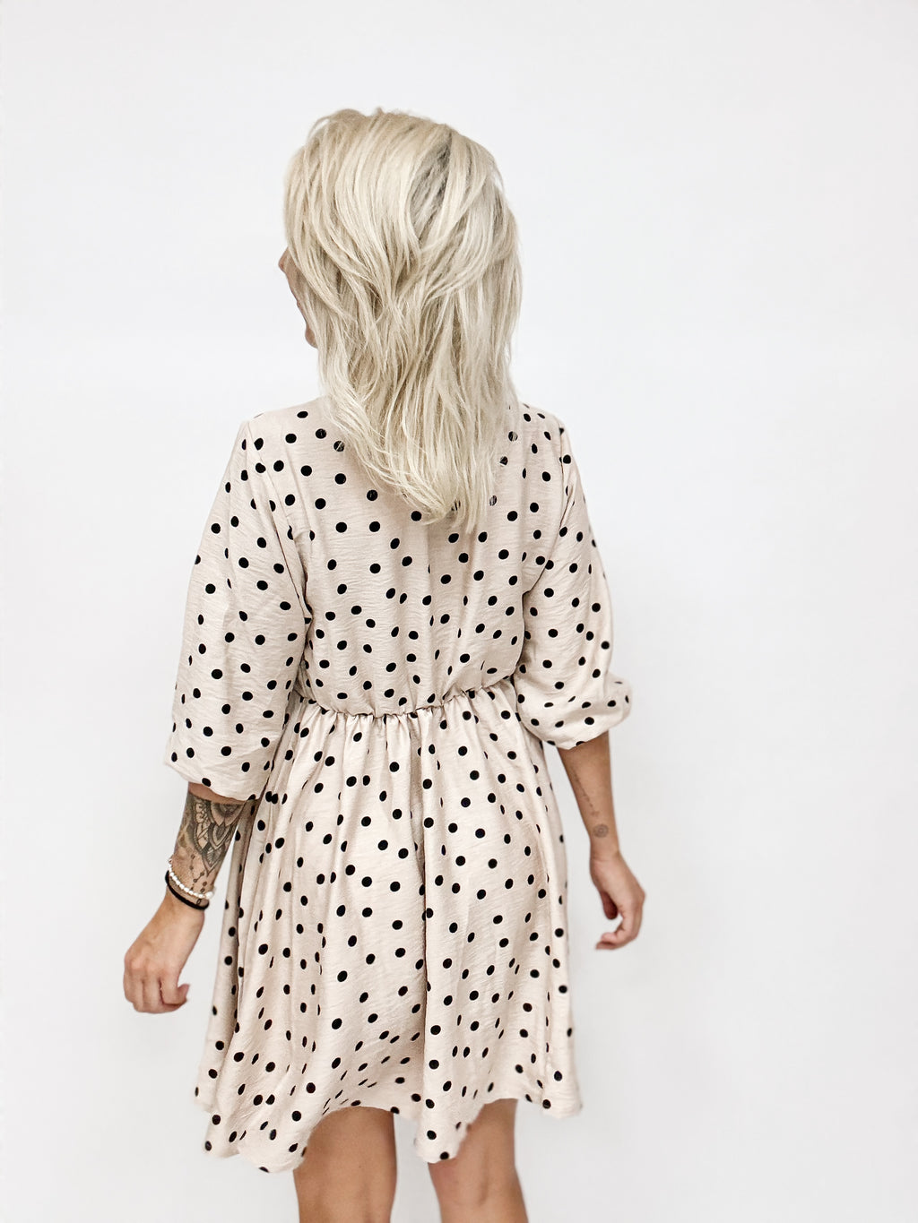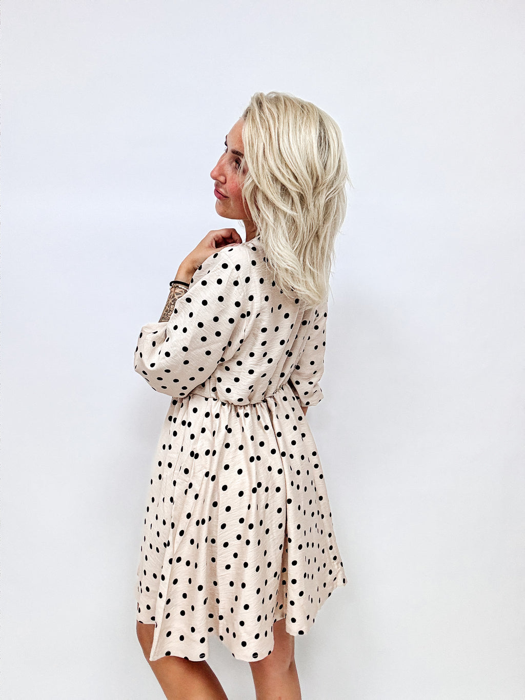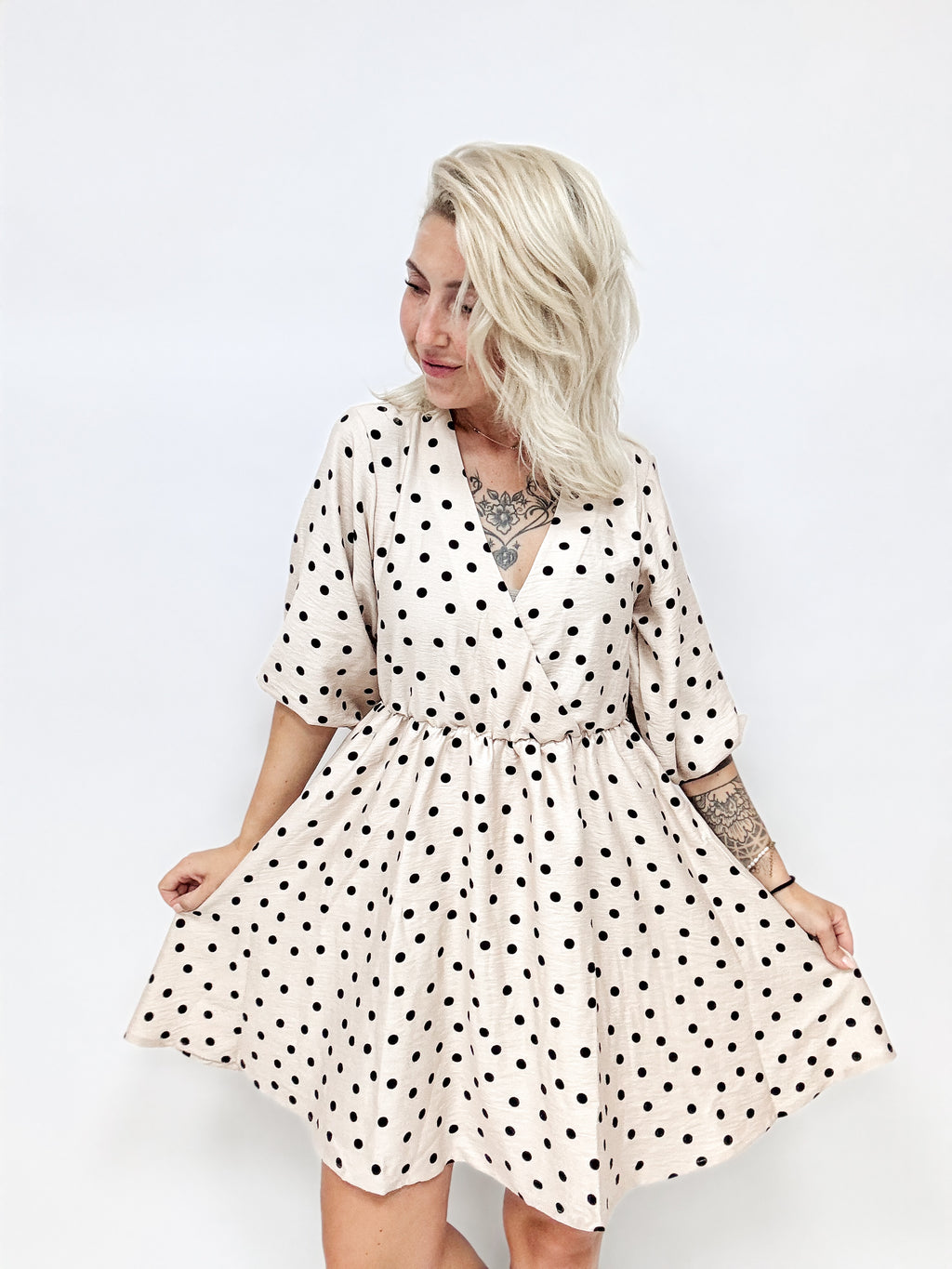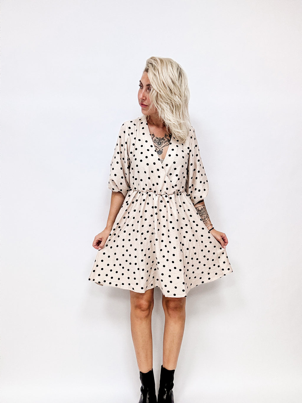 Kyla- ein bezauberndes, modernes aber dennoch zeitloses Kleid mit weitem Rock, breiten Ärmeln und einem bezaubernden V- Ausschnitt, welcher sich optisch überlappt und dennoch so fixiert wurde, dass die Einblicke nicht zu groß werden.
