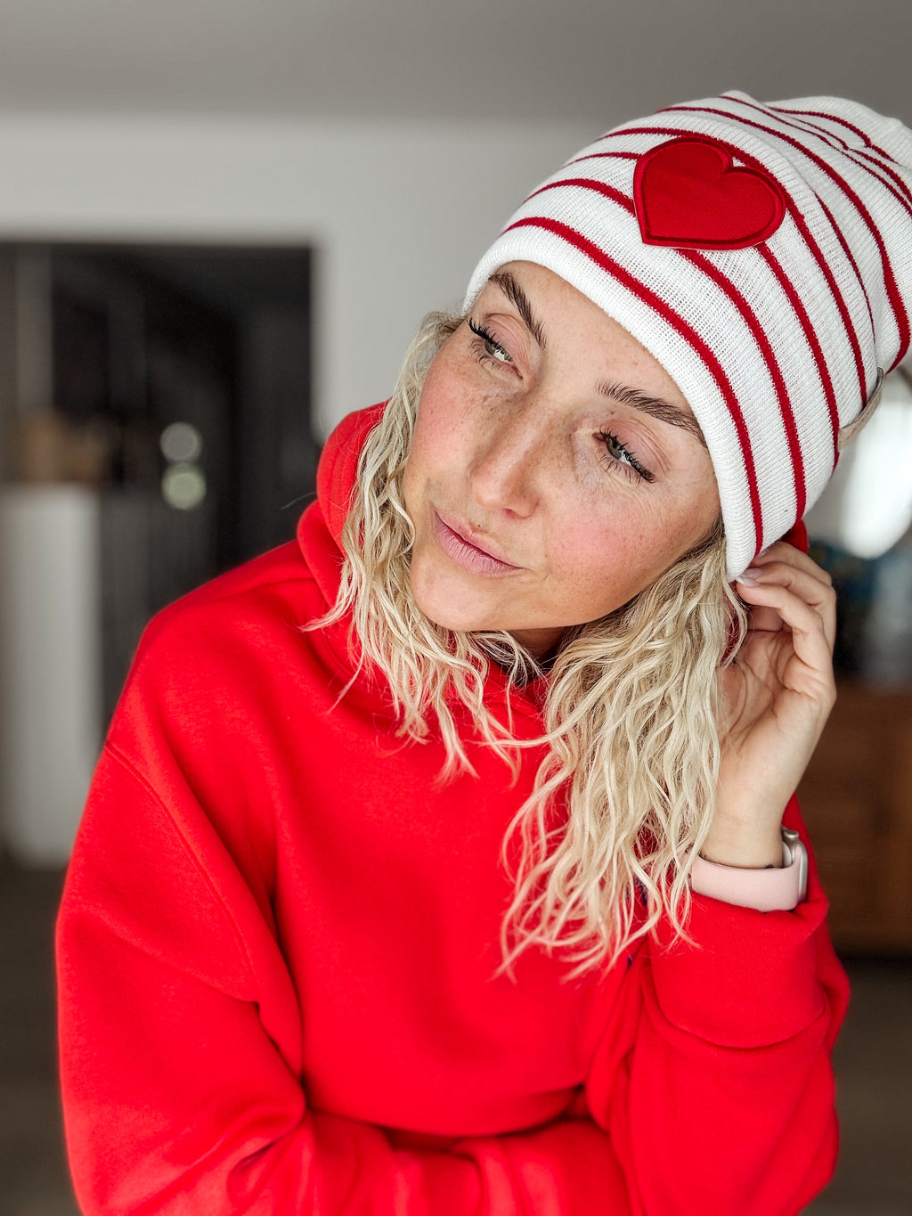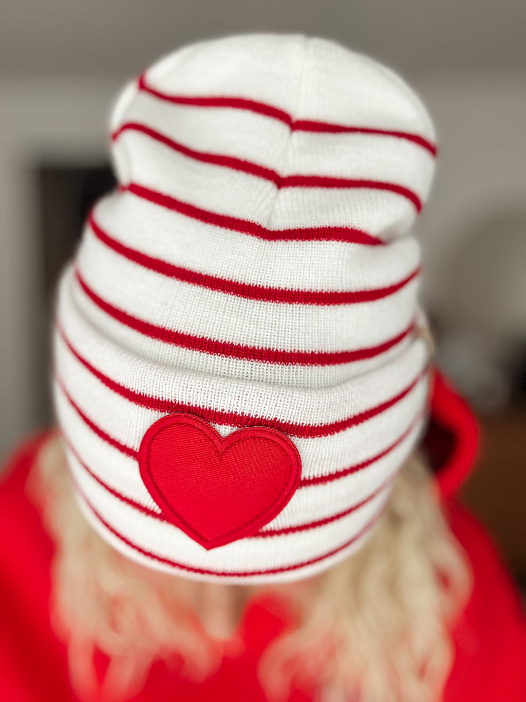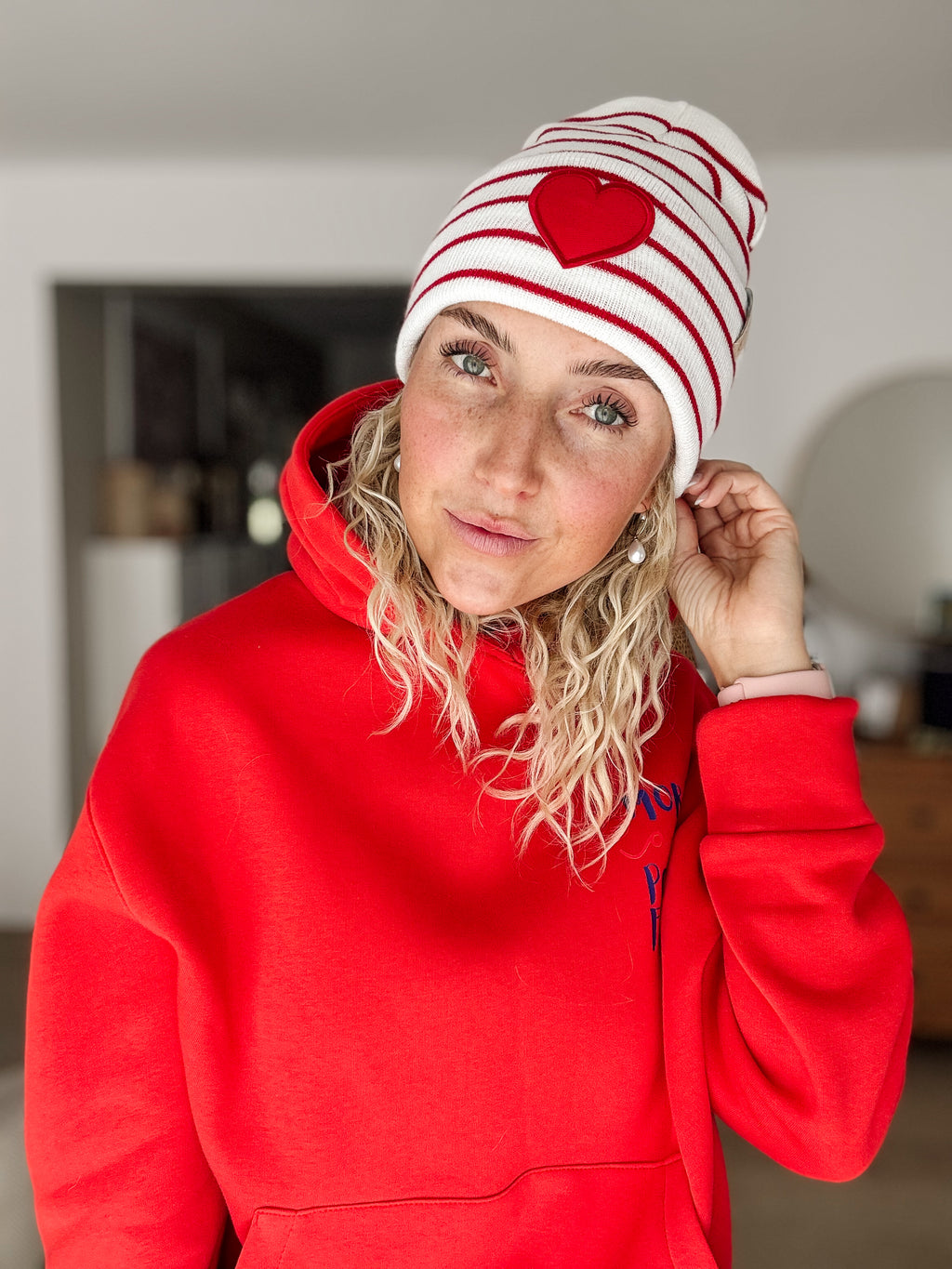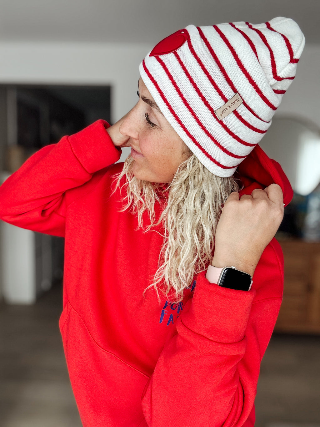 Diese süße Strickmütze von Frau Kauf ist das perfekte Accessoire für kalte Tage. Das klassische Ringeldesign in Weiß und Rot wird durch eine auffällige Herz-Applikation auf der Vorderseite zum besonderen Hingucker.