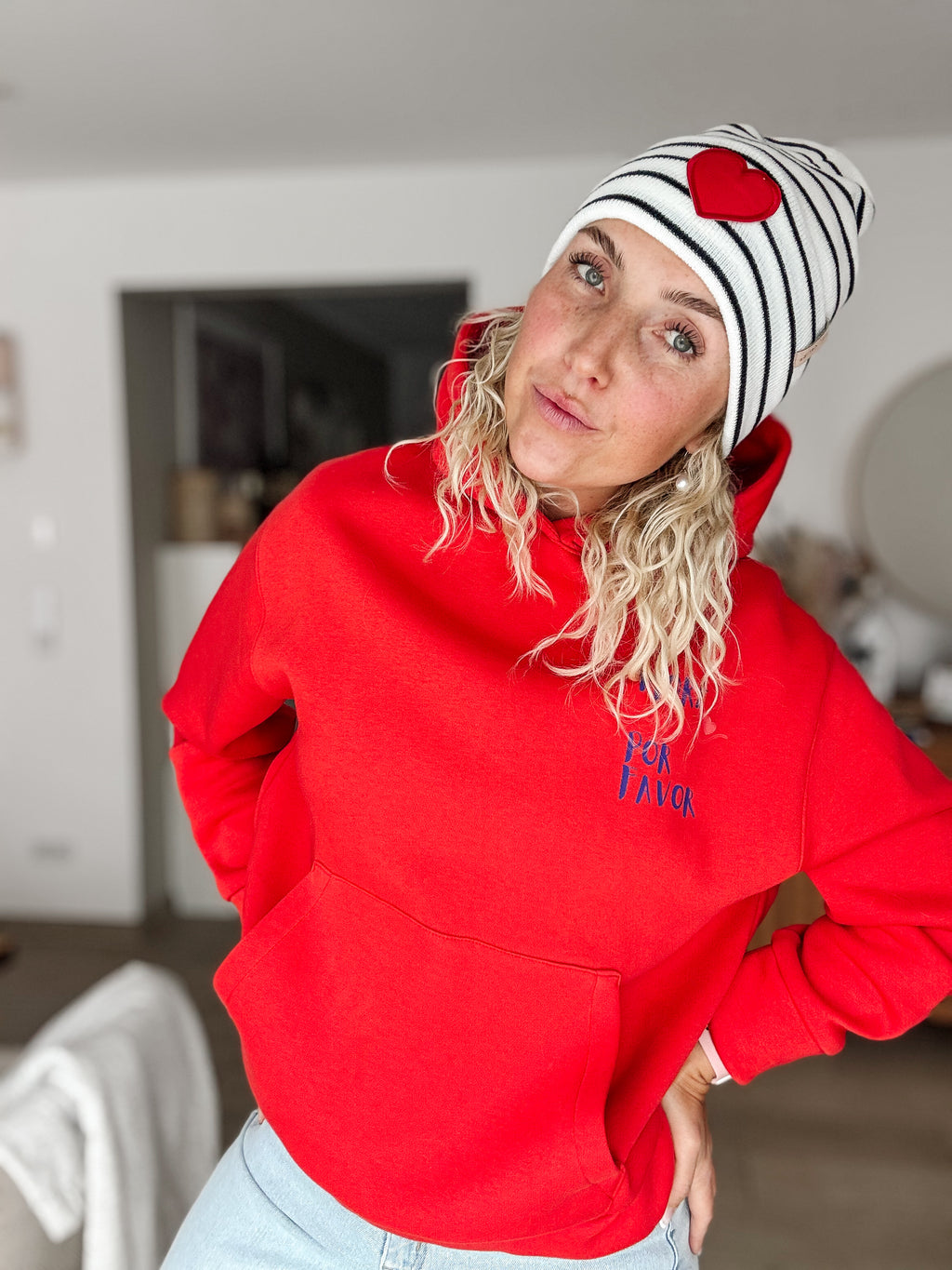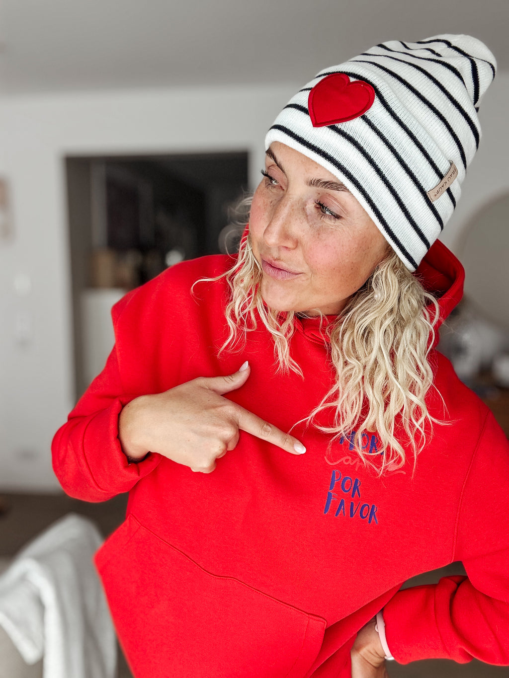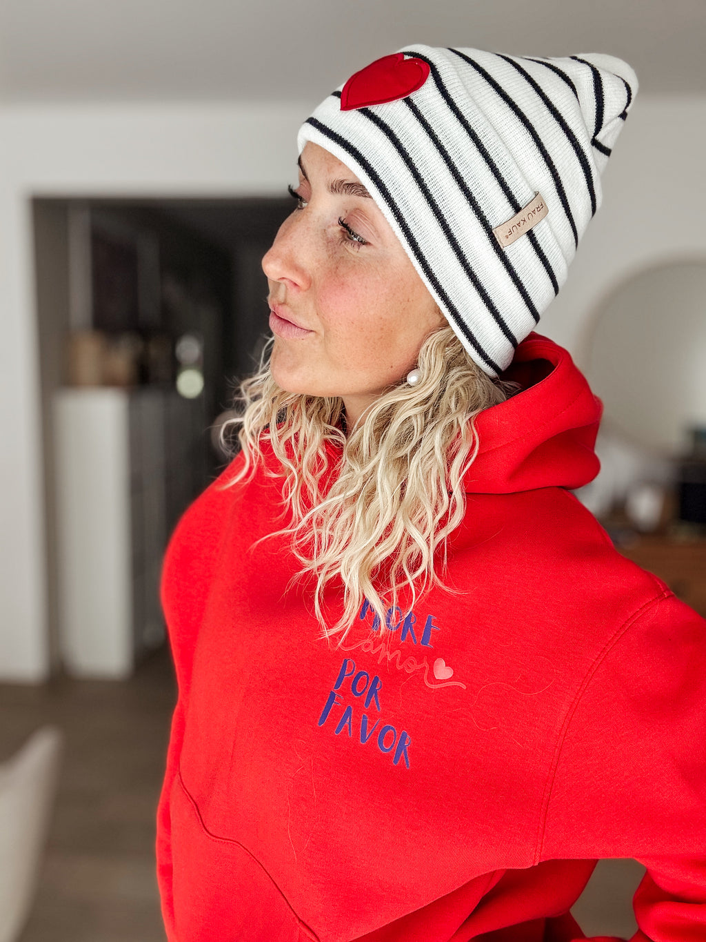 Dank der weichen, elastischen Qualität sitzt die Beanie angenehm am Kopf und hält zuverlässig warm. Ob beim Spaziergang, Stadtbummel oder einfach als stylisches Statement – mit dieser Mütze setzt du ein modisches Zeichen mit Herz.