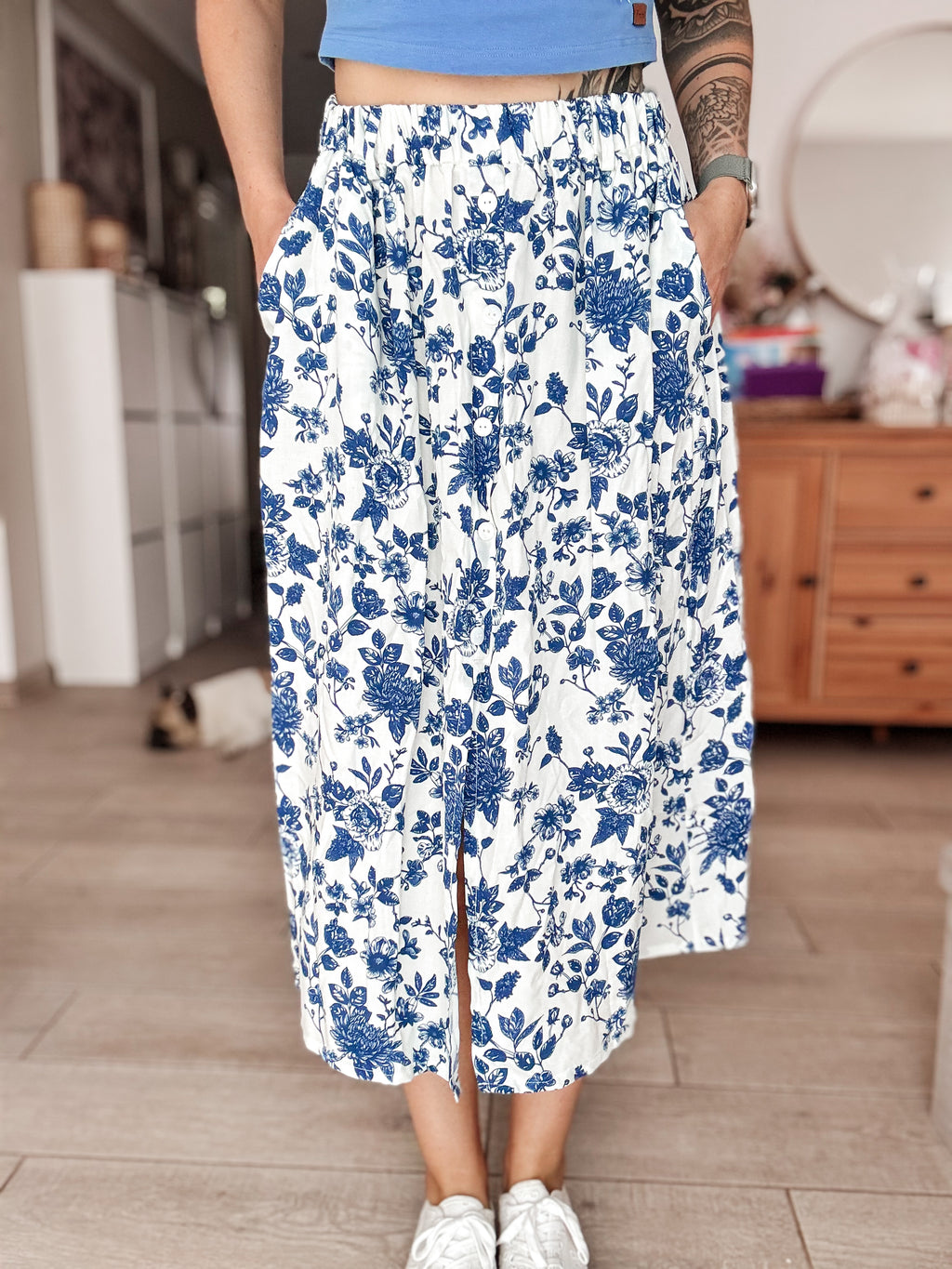 Ein traumhaft schöner und bequemer Wadenlanger Rock mit Schlitz und Knopfleiste. Du kannst in dank des Gummibundes in der Taille tragen oder auf Hüfte, wobei wir ersteres stylischer finden, vor allem zu unseren Cropped Tops. Mit diesem Style holt ihr Eure Taille ins Rampenlicht, fühlt Euch gut angezogen und Stilsicher.