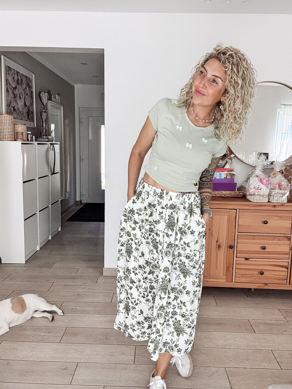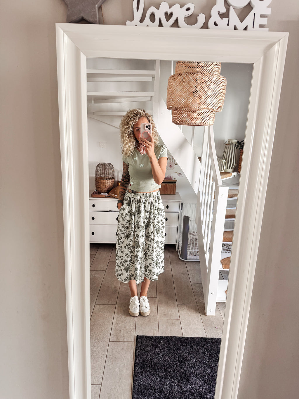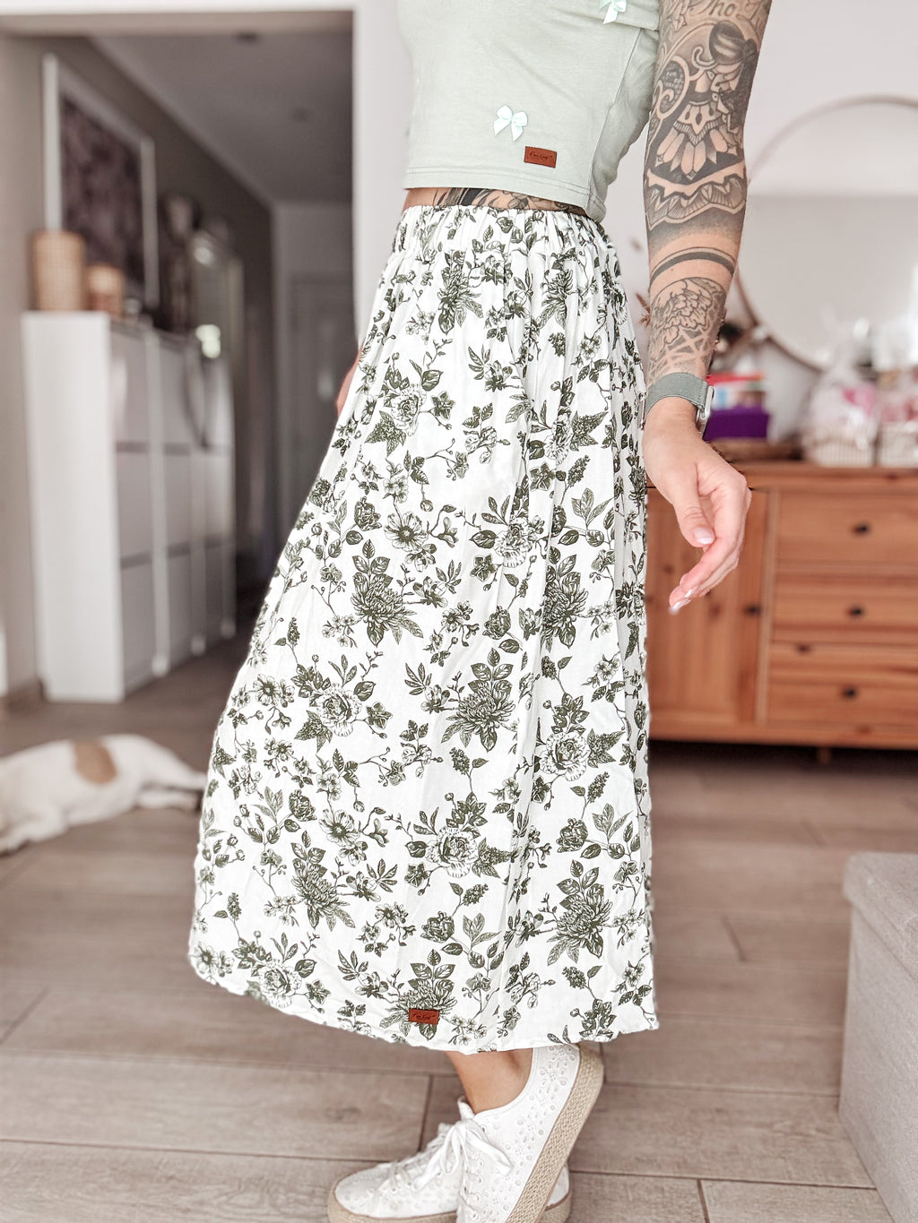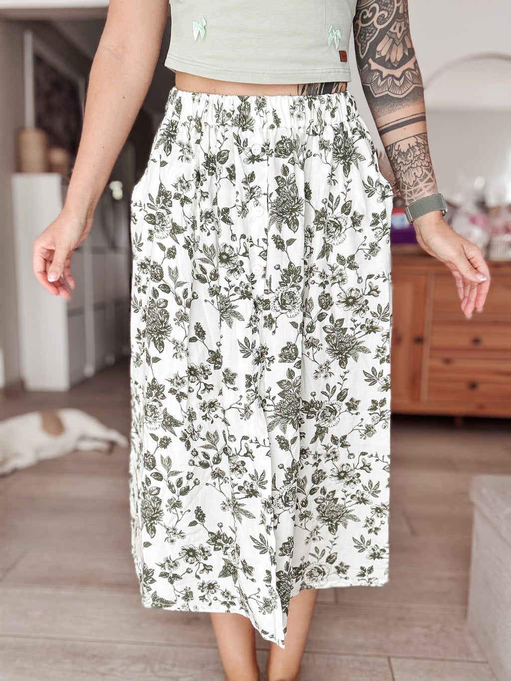 Ein traumhaft schöner und bequemer Wadenlanger Rock mit Schlitz und Knopfleiste. Du kannst in dank des Gummibundes in der Taille tragen oder auf Hüfte, wobei wir ersteres stylischer finden, vor allem zu unseren Cropped Tops. Mit diesem Style holt ihr Eure Taille ins Rampenlicht, fühlt Euch gut angezogen und Stilsicher.