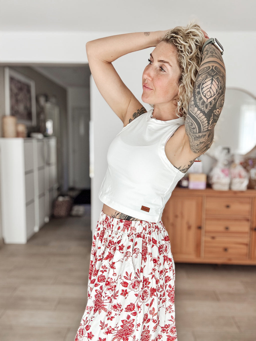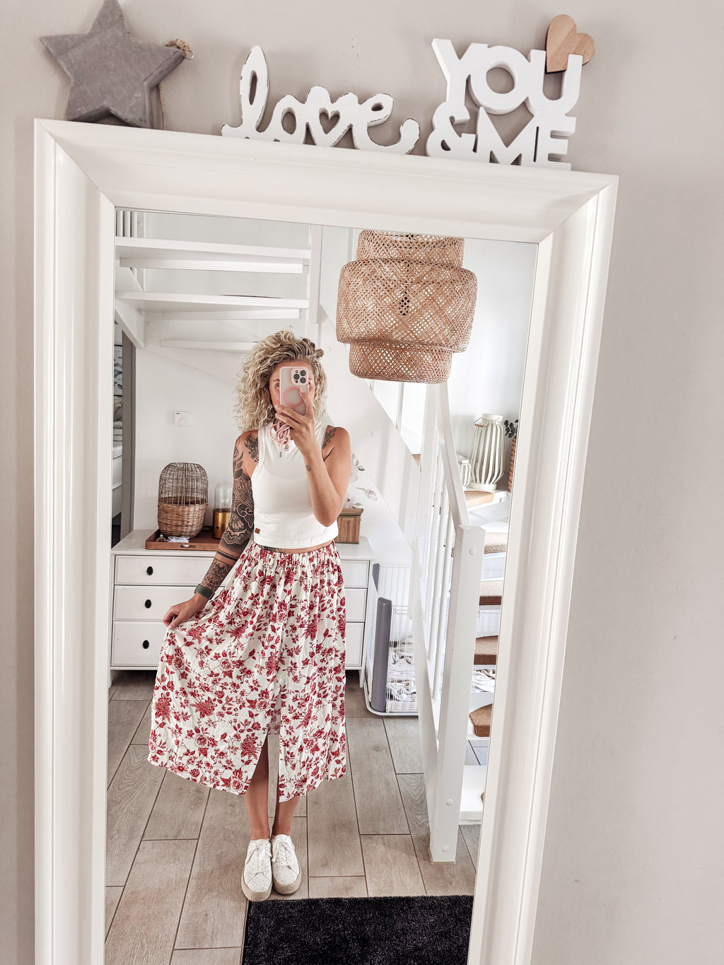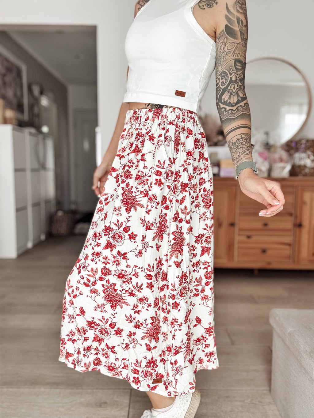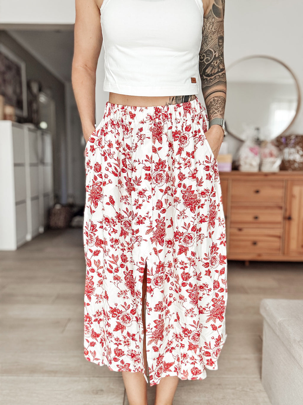 Ein traumhaft schöner und bequemer Wadenlanger Rock mit Schlitz und Knopfleiste. Du kannst in dank des Gummibundes in der Taille tragen oder auf Hüfte, wobei wir ersteres stylischer finden, vor allem zu unseren Cropped Tops. Mit diesem Style holt ihr Eure Taille ins Rampenlicht, fühlt Euch gut angezogen und Stilsicher.