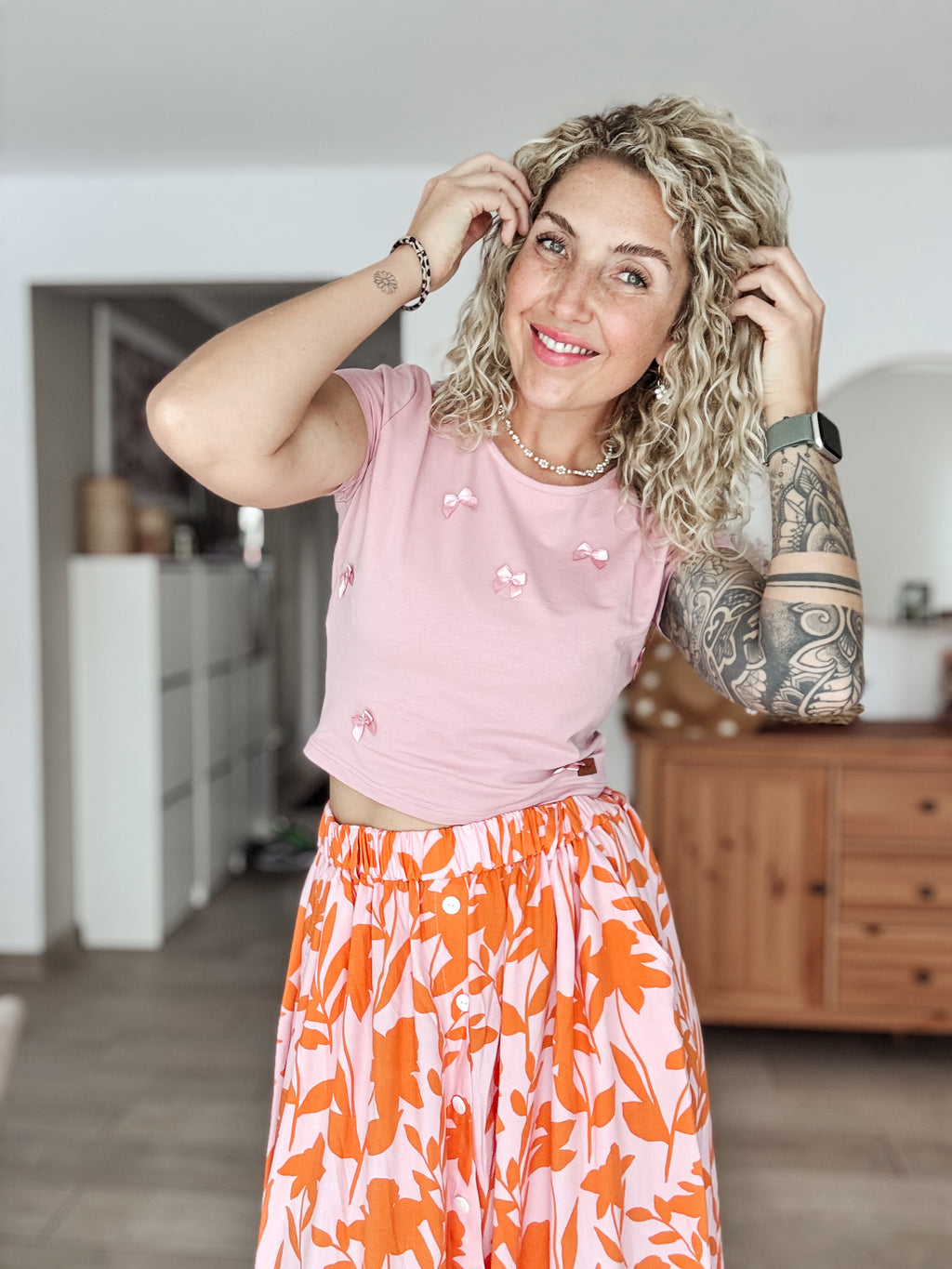 Figurbetontes Top mit niedlichen Accessoires. Perfekt in Kombination mit unseren Röcken oder Shorts.