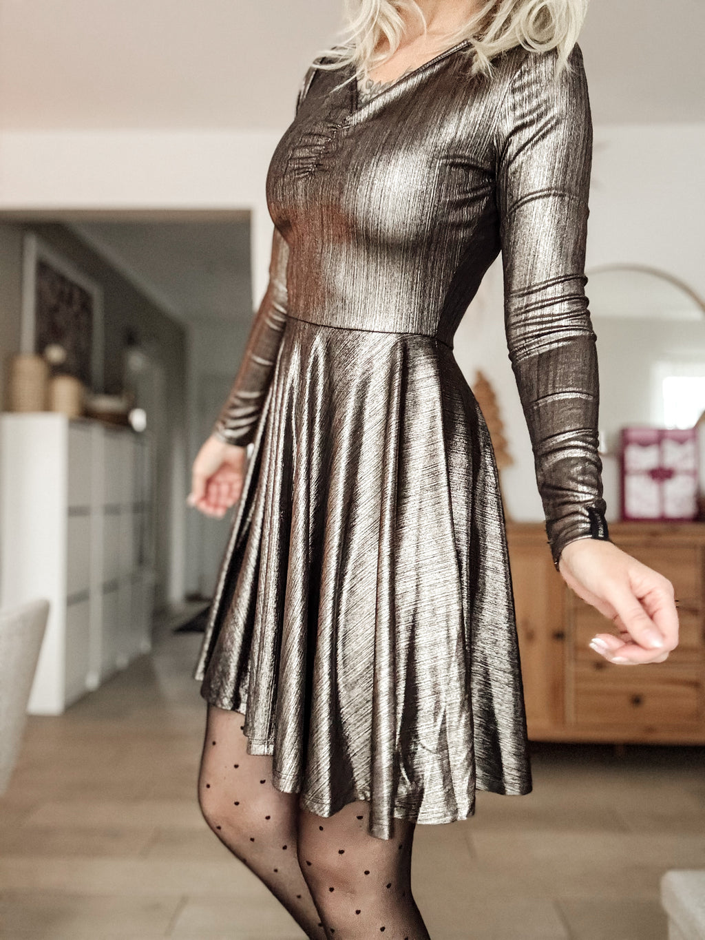 Dieses wunderschöne Kleid von Frau Kauf verbindet feminine Eleganz mit angenehmem Tragekomfort. Der figurnah geschnittene Oberteil-Bereich geht in einen leicht schwingenden Rock über und sorgt für eine schmeichelhafte Silhouette. Mit seinem glamourösen Stoff wird es zum zeitlosen Hingucker – ob im Alltag, im Büro oder zu besonderen Anlässen.