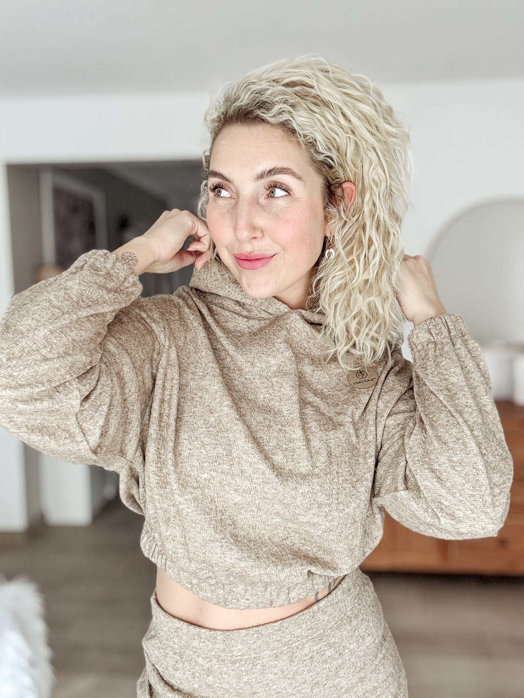 Schnitt: Cropped Hoodie , mit Kapuze, Gummizug an Bauch und Armbündchen