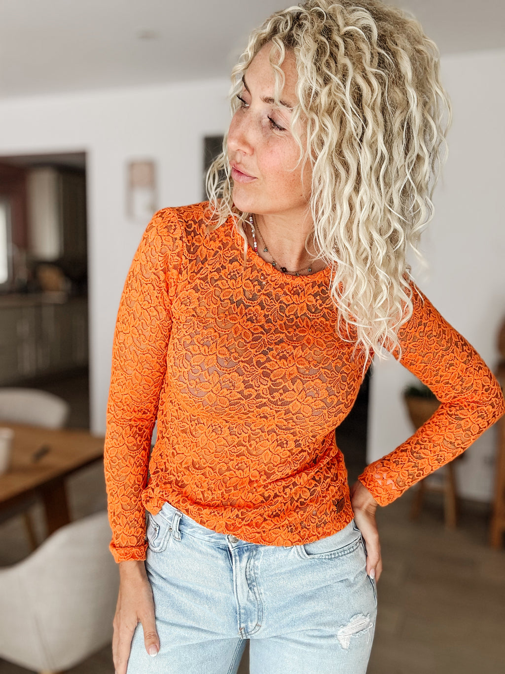 Dieses feminine Langarmshirt besticht durch sein auffälliges Design und die aufregende Transparenz. Der leuchtend orangefarbene Spitzenstoff mit floraler Musterung macht das Oberteil zu einem echten Hingucker. Die figurbetonte Passform sorgt für eine moderne Silhouette, während der Rundhalsausschnitt dem Look eine klassische Note verleiht.